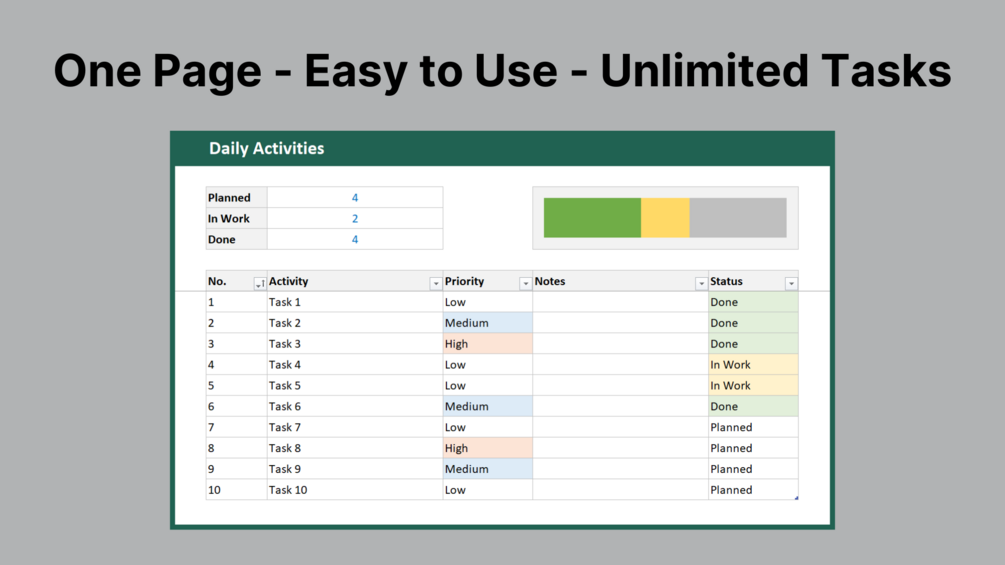 Track your daily tasks and activities right in Excel. Stay organized at home or at work.